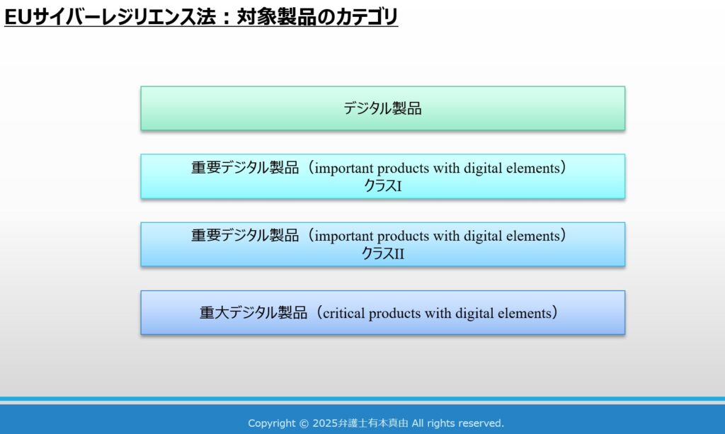 上図において下にいくほど求められるセキュリティ水準が高いカテゴリとなっており、各カテゴリに該当する製品は、CRAの附属書III(重要デジタル製品)、附属書IV(重大デジタル製品)に記載されています。